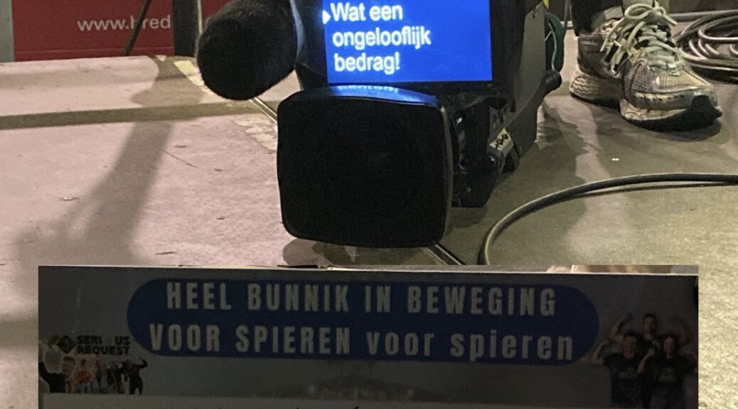 Na het halen van de toegangsbandjes was het nog even wachten tot we werden opgehaald door iemand van de organisatie die ons begeleidde naar de coulissen achter het podium. Een korte uitleg en oefening voor Jesper en Jan wat ze moesten doen. En toen om 19:45 uur was het zover. We gingen ‘on-stage’ onder een oorverdovend lawaai en applaus van de ruim 7000 mensen op het plein. Om 19:50 uur kwam het sein ‘on-air’. Presentator Jurre Geluk stelde wat vragen aan Jesper over onze actie in Bunnik. We konden onze bijdrage op een groot bord aan het publiek en de kijkers in het land laten zien: €54.168!