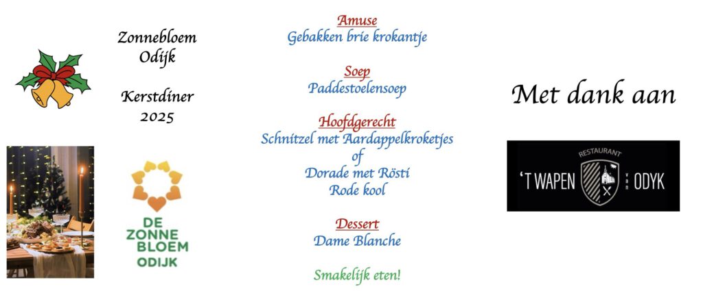 Het jaarlijkse Kerstdiner is traditioneel de laatste activiteit van de Zonnebloem Odijk.